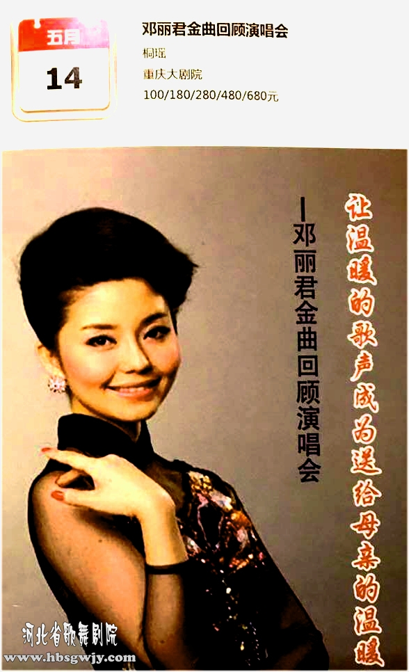 河北省歌舞劇院的經典商演劇目《鄧麗君經典歌曲演唱會》14日母親節在重慶大劇院完美演出 。整場演出進行了兩小時十五分鐘,大大超過了正常演出時間,主要是因為重慶觀眾非常之熱情,我們要不斷地增加演出曲目,來滿足觀眾們的需求。