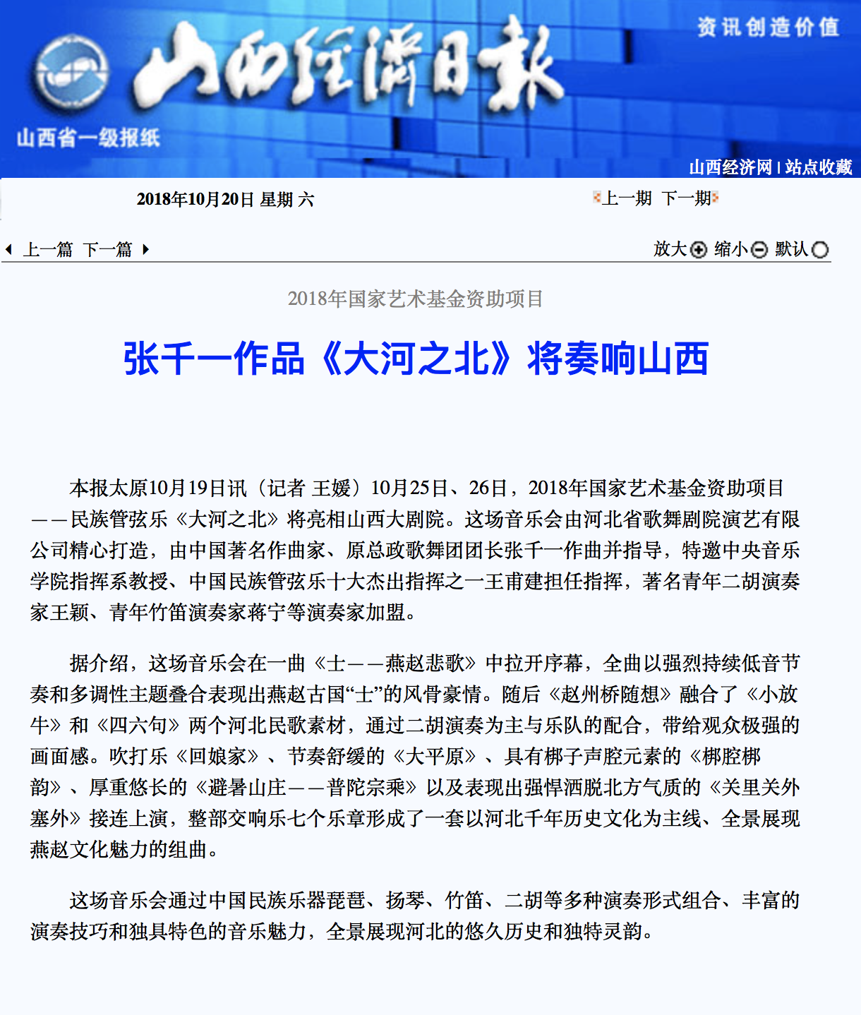 本報太原10月19日訊(記者 王媛)10月25日、26日,2018年國家藝術基金資助項目——民族管弦樂《大河之北》將亮相山西大劇院。這場音樂會由河北省歌舞劇院演藝有限公司精心打造,由中國著名作曲家、原總政歌舞團團長張千一作曲并指導,特邀中央音樂學院指揮系教授、中國民族管弦樂十大杰出指揮之一王甫建擔任指揮,著名青年二胡演奏家王穎、青年竹笛演奏家蔣寧等演奏家加盟。FTS河北省歌舞劇院演藝有限公司