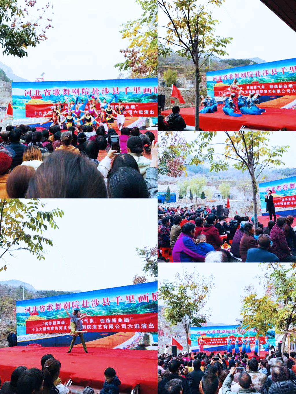 11月7號至10號,舞劇團六進演出一行30人走進邯鄲革命老區涉縣偏城鎮、固新鎮等地進行慰問,演出為老區人民送上了一場場的精彩演出。獨舞《老爸》的演員用情至深,用肢體語言完美演繹了在外游子對父母的眷戀之情,不少老人觀看后流下了熱淚。雙人舞《芳華》以高難度的雙人舞托舉及演員細膩的表演,還原了在那個年代里,正直芳華的青年們……引得觀眾們掌聲不斷。青春歌舞show,歡快動感與場下小朋友一起歡樂互動。每一位歌手都以飽滿的熱情把自己最拿手的曲目一一奉獻給鄉親們,尤其最后以一曲《國家》加以舞蹈演員的配合作為最后的壓軸節目,展現了國的強大與家的祥和!