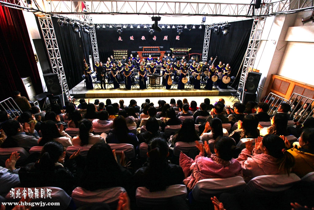11月21-29日, 歌舞團、舞劇團、民族樂團走進了石家莊各所學校。民族樂團在城市音樂廳為石家莊學院演出了精彩的音樂會,并且把音樂會帶進了市第四十九中學報告廳,舞劇團的演員們演出走進了新夢想藝術培訓學校,歌舞團把精彩的歌舞帶到了市裕華路小學。