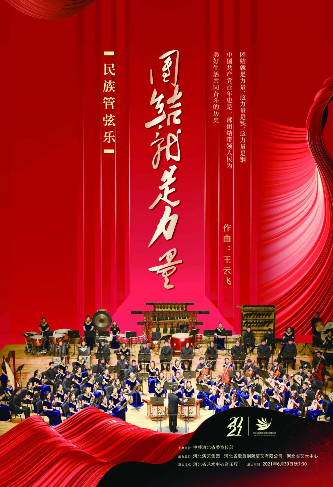 民族管弦樂《團(tuán)結(jié)就是力量》是以中國(guó)共產(chǎn)黨帶領(lǐng)中國(guó)人民團(tuán)結(jié)奮斗的光輝歷程與取得的偉大勝利為主題,創(chuàng)作推出的一部重大題材作品。主創(chuàng)團(tuán)隊(duì)借該作品獻(xiàn)禮建黨一百周年,以民族管弦樂為載體,用極其富中國(guó)特色的音樂語(yǔ)言謳歌贊頌中國(guó)特色社會(huì)主義事業(yè)在中國(guó)共產(chǎn)黨帶領(lǐng)下不斷從勝利走向勝利,迎來偉大祖國(guó)新時(shí)代繁榮昌盛的壯美局面。fC3河北省歌舞劇院演藝有限公司