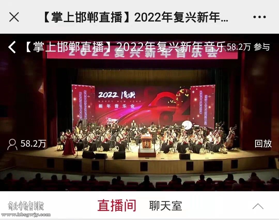 2021年12月31日晚,河北省歌舞劇院演藝有限公司民族樂團《2022復興新年音樂會》在邯鄲市復興區園博園4號館精彩上演。2022年新年音樂會以“弘揚偉大建黨精神、凝聚民族復興力量”為主題,通過現場觀看和網絡直播方式進行,既是一場公益的文化惠民活動,也是一次生動的紅色精神洗禮。