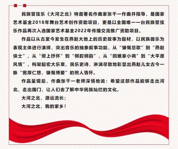民族管弦樂《大河之北》是河北省歌舞劇院建院以來推出的水平最高、陣容最強、最具河北地方特色的原創民族音樂會,是河北民族音樂的新名片。