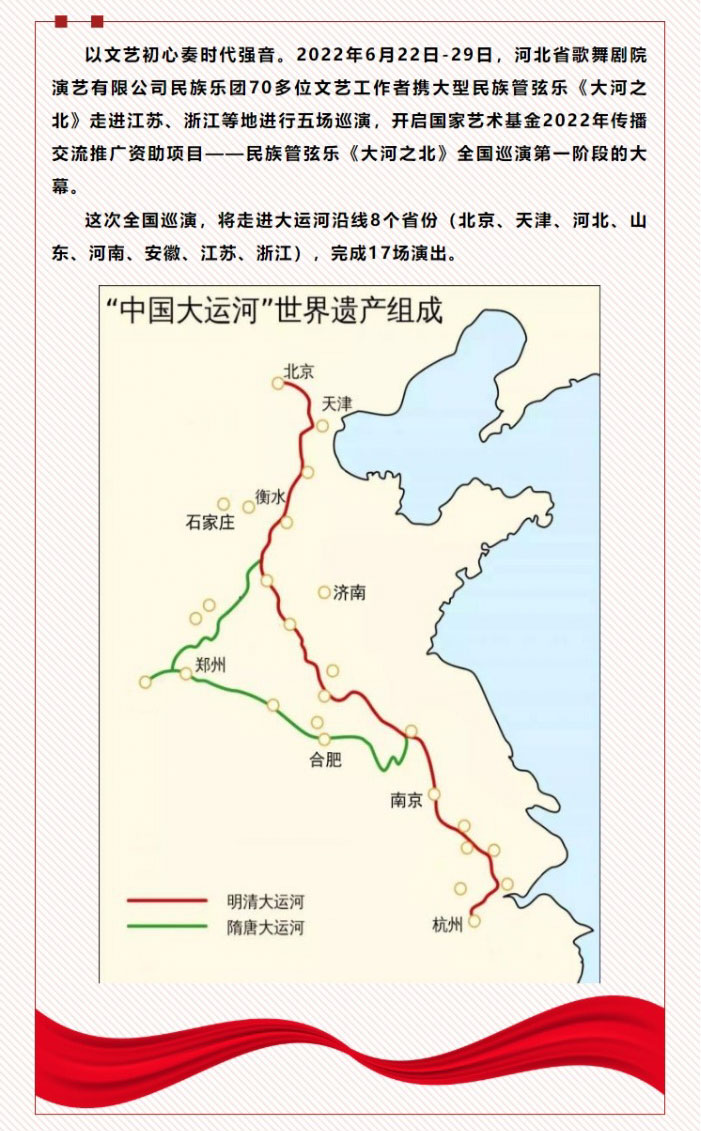 民族管弦樂《大河之北》正是以流淌于燕趙的歷史文化、革命文化和社會主義先進文化為主體,傾心打造的一臺民族管弦樂作品。作品既大氣恢弘,又細膩深沉,生動地展現了河北的山川風貌、歷史風格、人物風情。音樂具有著濃郁的河北特色,演奏中使用的管子、嗩吶、笛子等也是廣泛流行于河北的民間代表性樂器。p51河北省歌舞劇院演藝有限公司