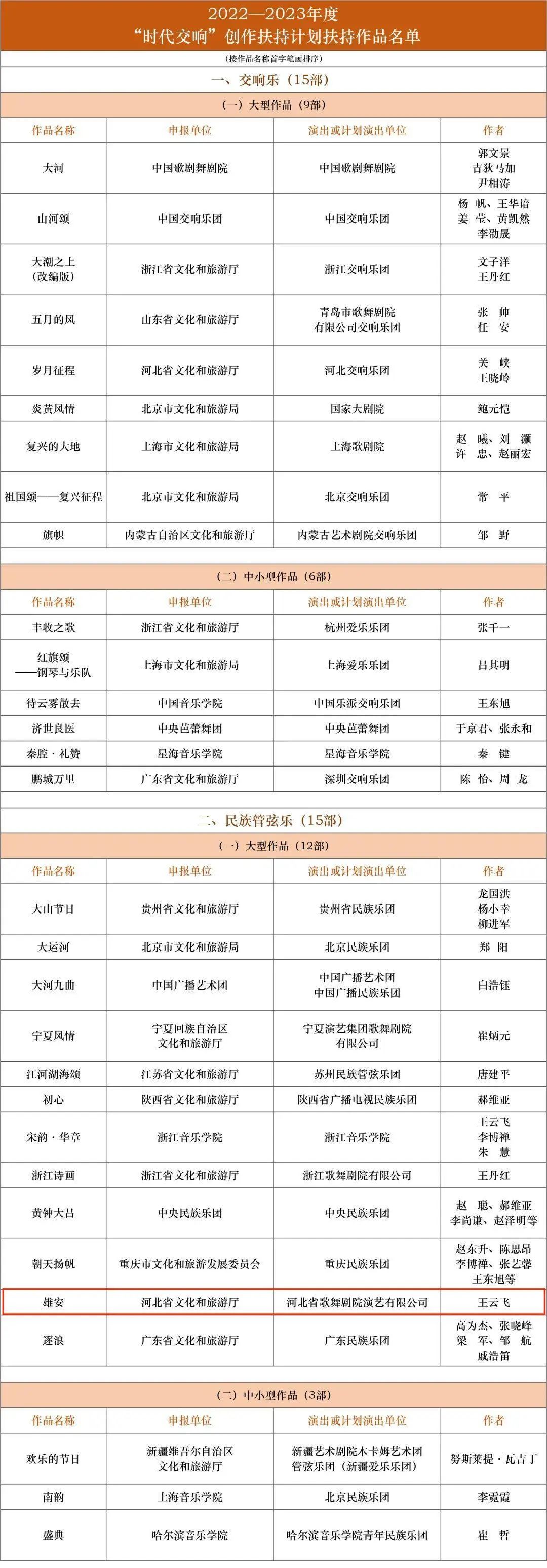 根據《文化和旅游部辦公廳關于開展2022—2023年度“時代交響”創作扶持計劃作品申報工作的通知》(辦藝發〔2022〕59號),文化和旅游部藝術司組織專家對申報作品進行了認真遴選,選出15部交響樂作品、15部民族管弦樂作品,作為2022—2023年度“時代交響”創作扶持計劃扶持作品。我院大型民族管弦樂《雄安》入選。kUc河北省歌舞劇院演藝有限公司