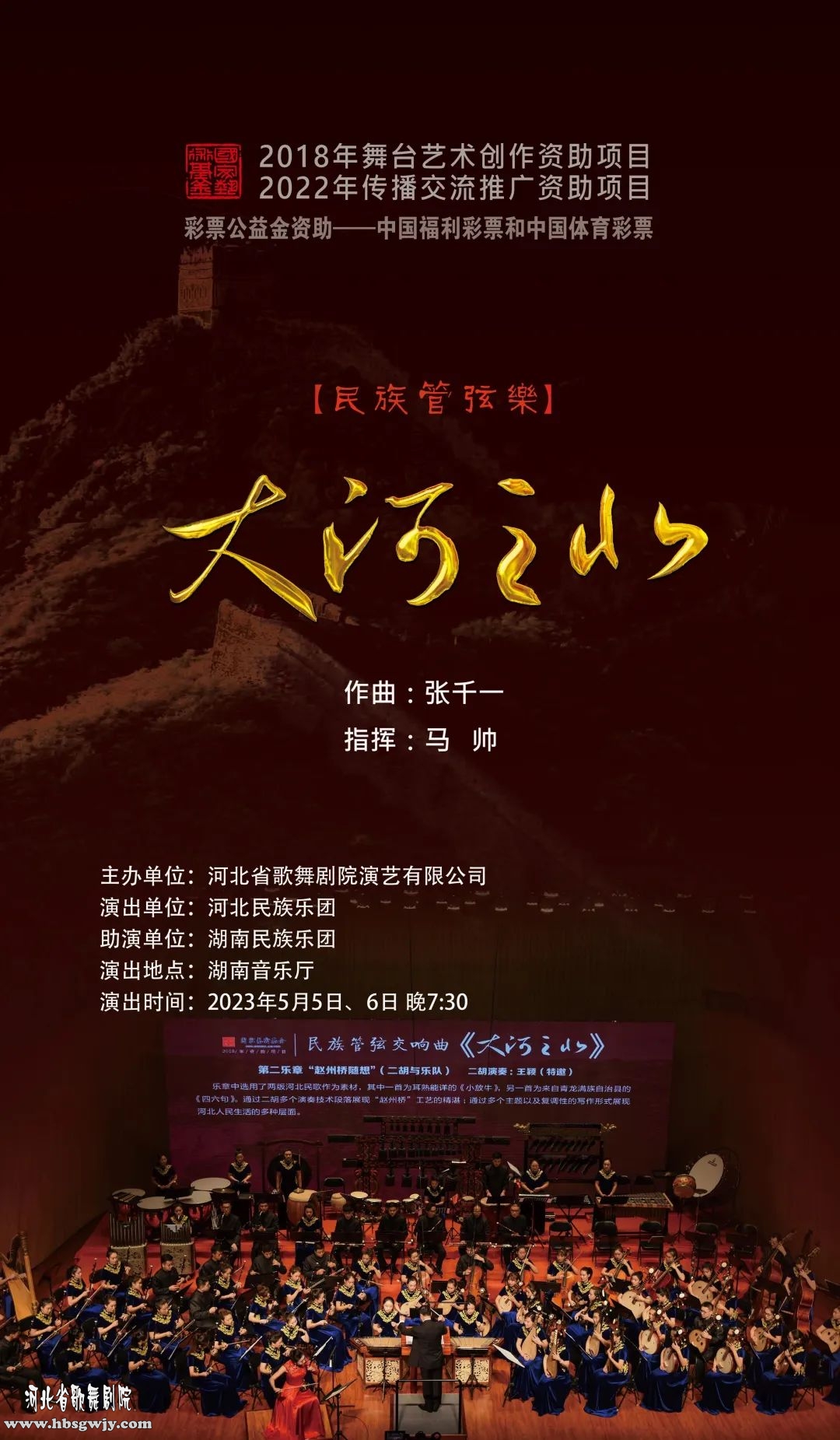 民族管弦樂《大河之北》特邀著名作曲家張千一作曲,由河北省歌舞劇院演藝有限公司傾心打造。作品入選國家藝術基金2018年度大型舞臺劇和作品創作資助項目,更是以全國唯一一臺民族管弦樂作品再次入選國家藝術基金2022年度傳播交流推廣資助項目。CNU河北省歌舞劇院演藝有限公司