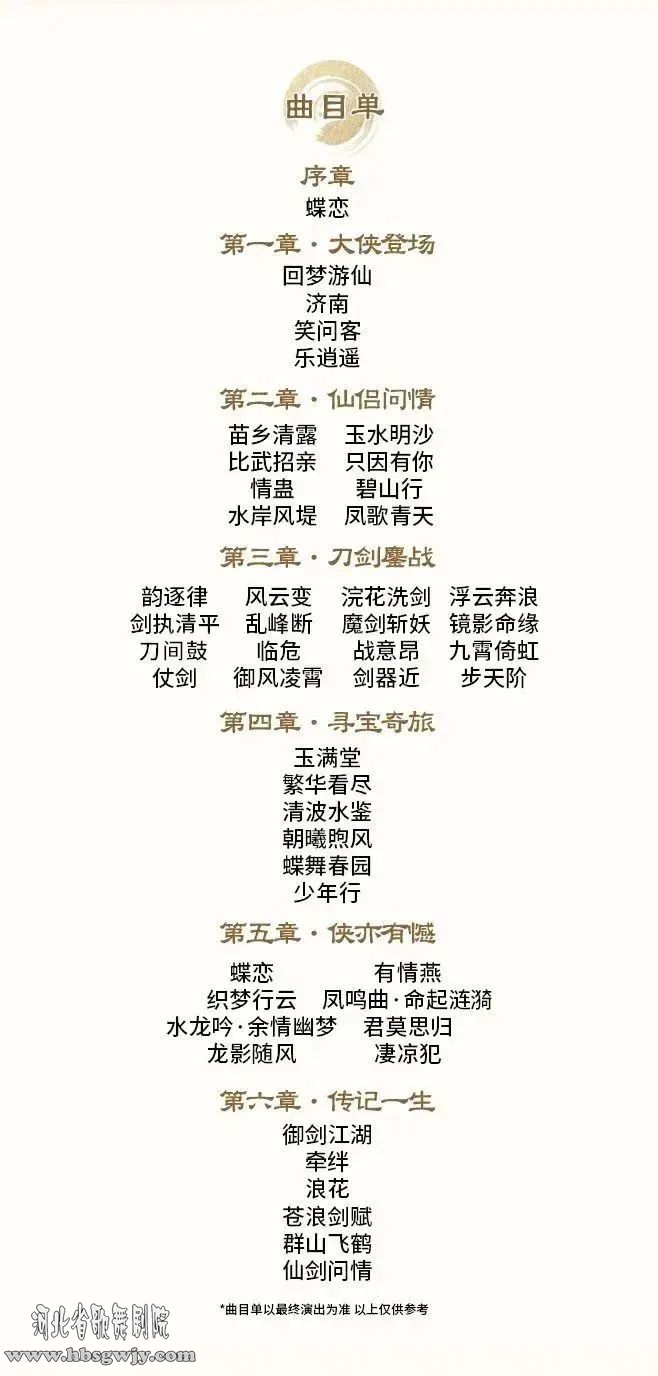 《仙劍奇俠傳》視聽音樂會由《仙劍奇俠傳》版權公司軟星科技(北京)有限公司官方授權,聚橙劇院、萬有音樂出品,石家莊大劇院聯合出品,囊括仙劍全系列經典游戲曲目,包含耳熟能詳的《蝶戀》《回夢游仙》《御劍江湖》《水龍吟·余情幽夢》《有情燕》等等,傳統古風與流行樂碰撞融合,打造絕美沉浸視聽體驗。4bQ河北省歌舞劇院演藝有限公司