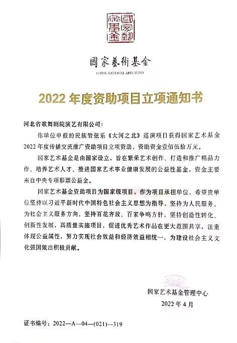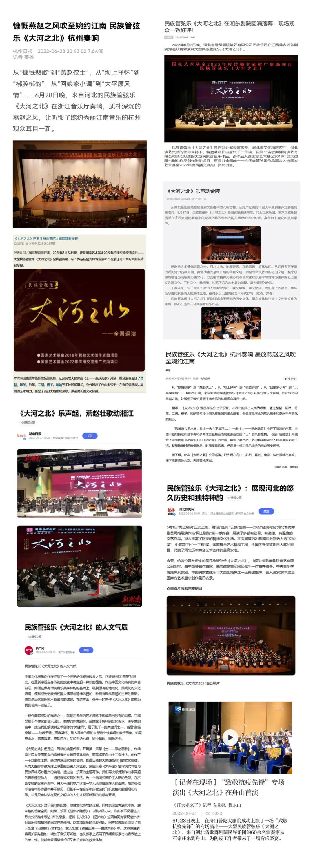 2021年,民族管弦樂《大河之北》入選文化和旅游部全國優秀劇目網絡展演和全國民族器樂展演、河北省慶祝建黨百年優秀文藝作品展演等重要活動: ![]() |