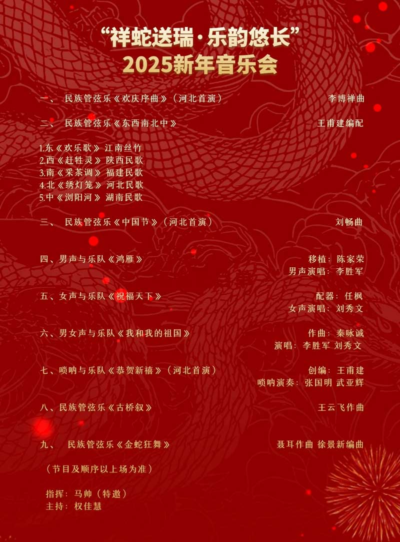 “祥蛇送瑞·樂韻悠長(zhǎng)”2025新年音樂會(huì)是我院“跟著演藝游河北”迎雙節(jié)系列演出之一,旨在引領(lǐng)觀眾跟著音樂去旅游——“這么近 那么美 周末到河北”,共賀新年!Nbj河北省歌舞劇院演藝有限公司
