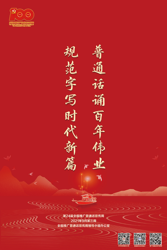 海報一,以“普通話誦百年偉業 規范字寫時代新篇”為設計思路,背景為中共一大會址浙江嘉興南湖,體現在黨的堅強領導下語言文字事業百年光輝歷程。